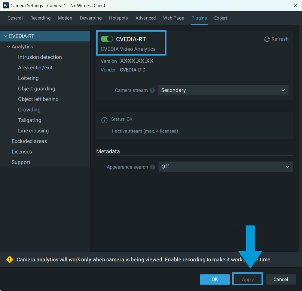 - Navigate to Camera Settings > Plugins > CVEDIA-RT > Crowding.